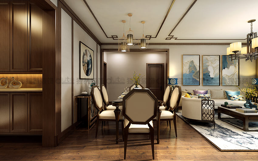 案例说明:业主夫妇都是教师,对中国传统文化相当痴迷。但是在设计里,对传统的表达不光寄情于山水大川,还可以利用对大自然景观的情怀,感物喻志,还原一个儒雅高柜坚毅的个性品质空间,本案在整个空间及软装陈设上遵循中式文化的精髓,突出精致优雅,内敛含蓄的特质。
