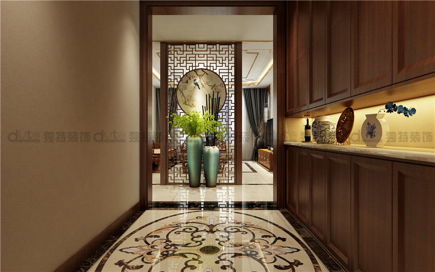 案例说明:本案在整个空间及软装陈设上遵循中式文化的精髓,突出精致优雅、内敛含蓄的特质,让业主在亦张亦弛中品鉴东方美学底蕴。整体造型采用园林借景设计,入户玄关的视觉点用景和物做隔断,半开半合中将实现引向内部空间。金属线条的加入给空间高级的视觉感,也给人高雅舒柔的情调,整个空间中有着深色的温柔,也有蓝色的沉静。