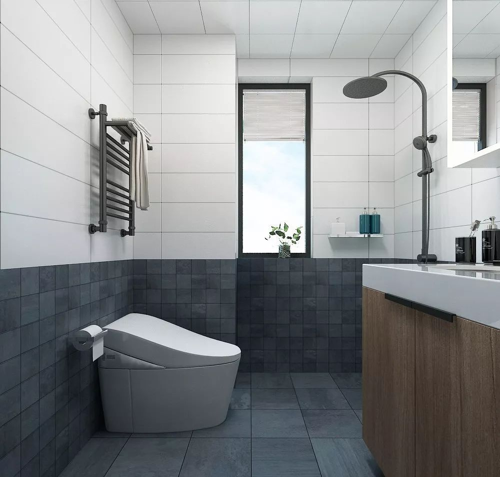 卫生间的墙面规划感一同,上面是白色,会让整个空间看上去亮堂许多,下面是深灰色的瓷砖铺的,很耐脏又很沉稳。
