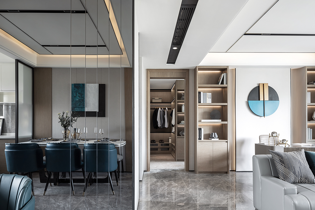 厨房与餐厅不设推门,解决了区域原本布局的狭窄弊端,同时利用镜面反射,增强空间的开阔性,且一虚一实,再造呼应。